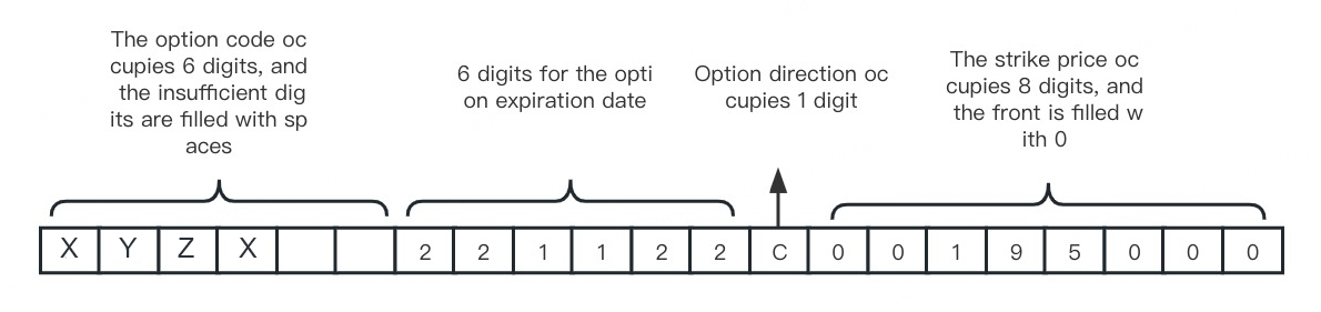 - Option strike price, value is price x 1000, fixed at 8 digits, with insufficient leading digits filled with 0
